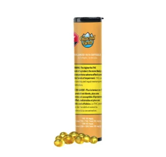 Glacial Gold Balanced 10:10 Softgels feature certified-organic MCT oil derived from coconuts, infused with high-purity THC and CBD distillates from Nextleaf Labs. Available in a convenient trial size 10-pack providing 100mg total THC and 100mg total CBD per package.